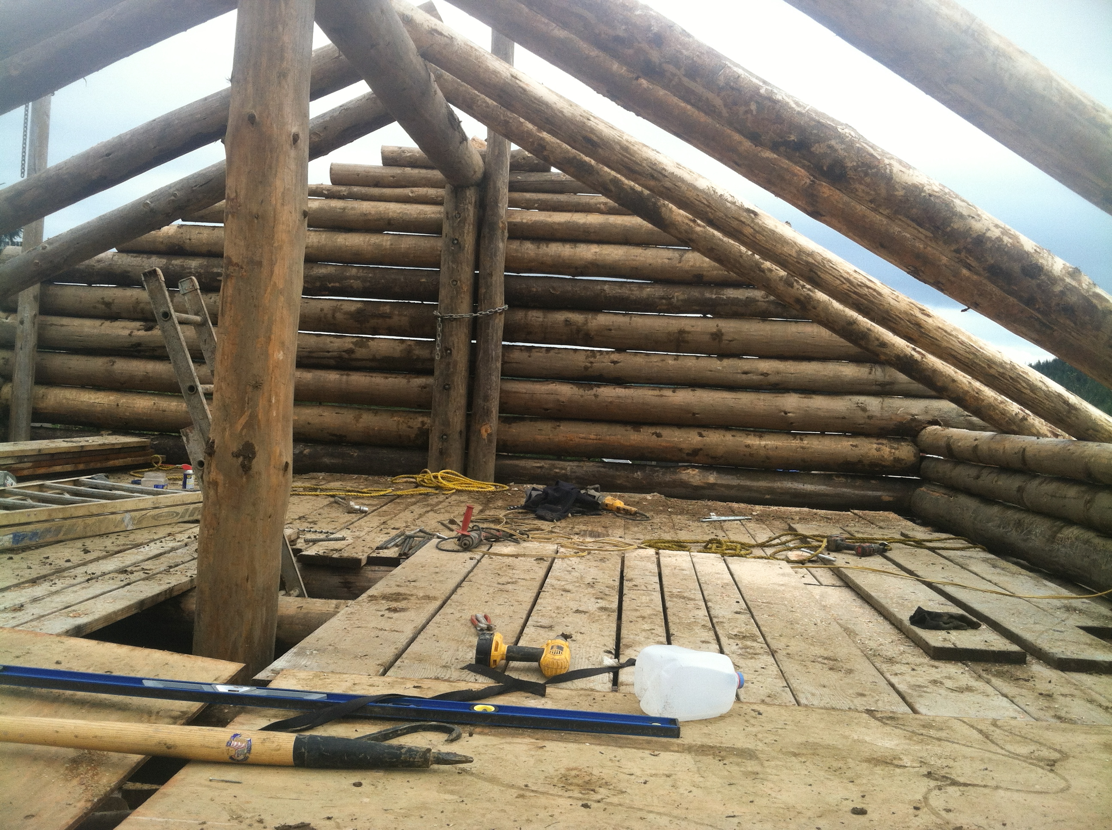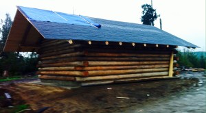 Now it was time to seal the weather out. There are many choices on the market for sealing logs/wood. I went with Jack’s experience and choose Sikkens Prolux Cetol Log/Siding Sealer. $350-$400 per 5gallons. Quite a bit to spend until you think about all that you have into your log structure both time and money…and you consider the frequency of re-application later. Spend it. It took 10 gallons to cover one coat over our 24×30 garage. I am in the process of adding a second coat. That should protect the logs for four years. Remember, the eaves and gable ends do the most protecting. FYI-you can buy Behrs sealer for $130 for 5 gallons. Go with experience…Sikkens. For the 2x6TG eaves and gable ends we decided to use an exterior paint instead of the Sikkens. That should keep things protected for 10 years. You loose the wood grain but we thought it was worth the extra protection and less effort overall. We choose a ‘light cream’ color to match the yellow 2×6 wood.